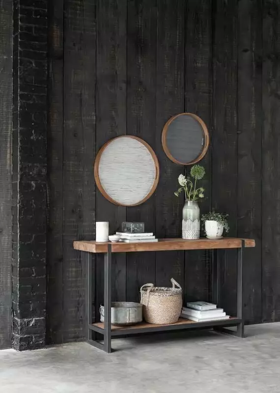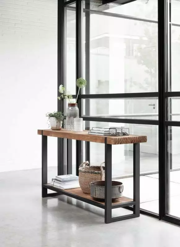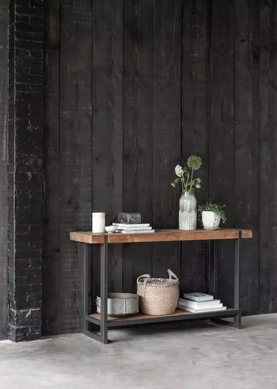 Katsetta ja elämää kestävään sisustustyyliin jykevä tiikkipuinen konsolipöytä. Upea 6cm paksu taso kierrätystiikistä ja rautarunko kestää vaikka sisustaisit betoniruukun tämän päälle – ja siinäpä vasta olisikin hyvä idea! Puinen alahylly tuo lisäsäilytystilaa. Toimii mainiosti eteisen laskutilana ja kauniina sisustuselementtinä sekä myös olohuoneen sisustukseen. Sama malli saatavana myös mustana.