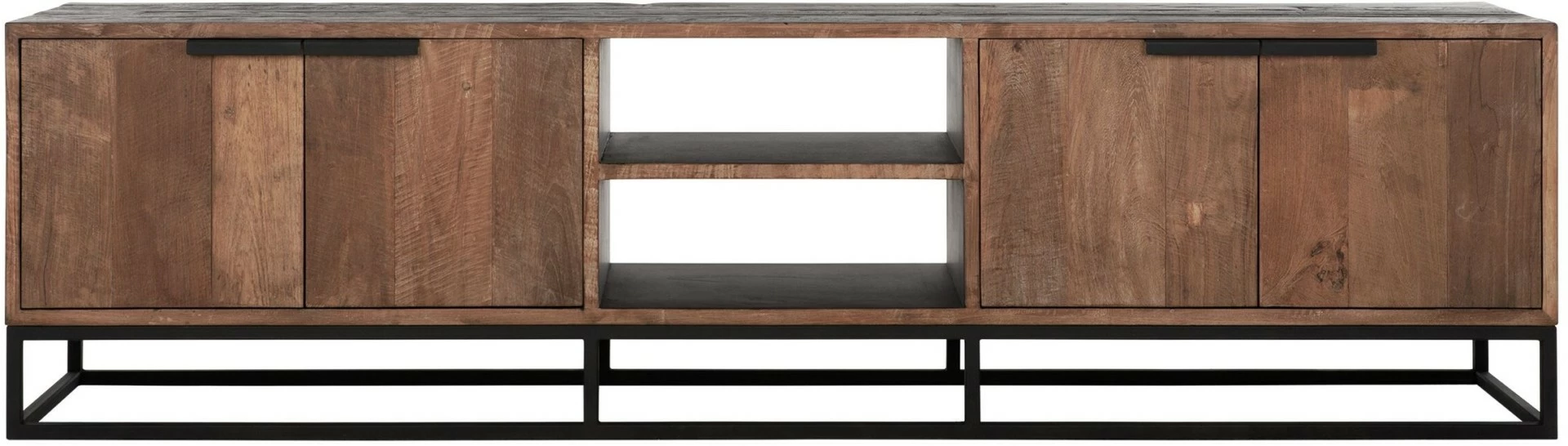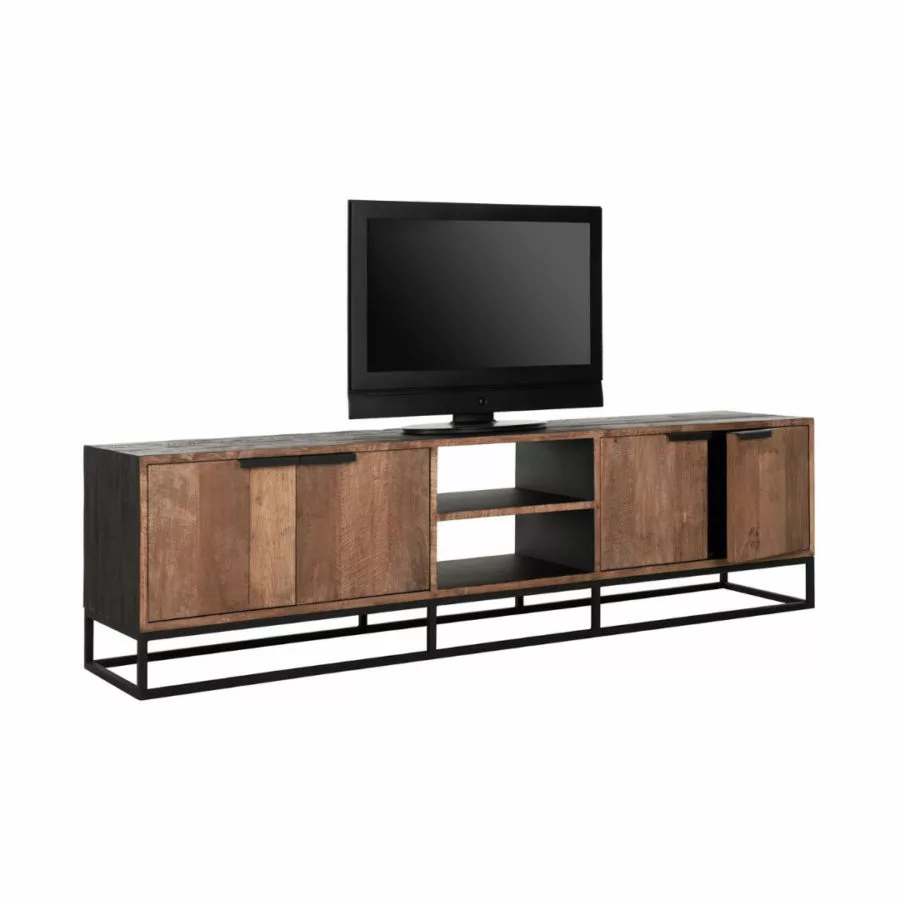 Tyylikäs suuri tiikkipuinen TV-taso vahvoilla mustilla metallijaloilla. Neljä isoa kaappia säilytykseen sekä kaksi avohyllyä vekottimille, joiden pitää pysyä esillä. Rouheasti viimeistelty tiikkipinta tuo kotoisuutta ja lämpöä sisustukseen. Rautajalat nostavat tv-tason käytännöllisesti vähän lattiatasosta, mikä tekee huonekalusta ilmavan. Kaunis ja helppohoitoinen tiikkipuu on kestävä ja ikuinen materiaali.