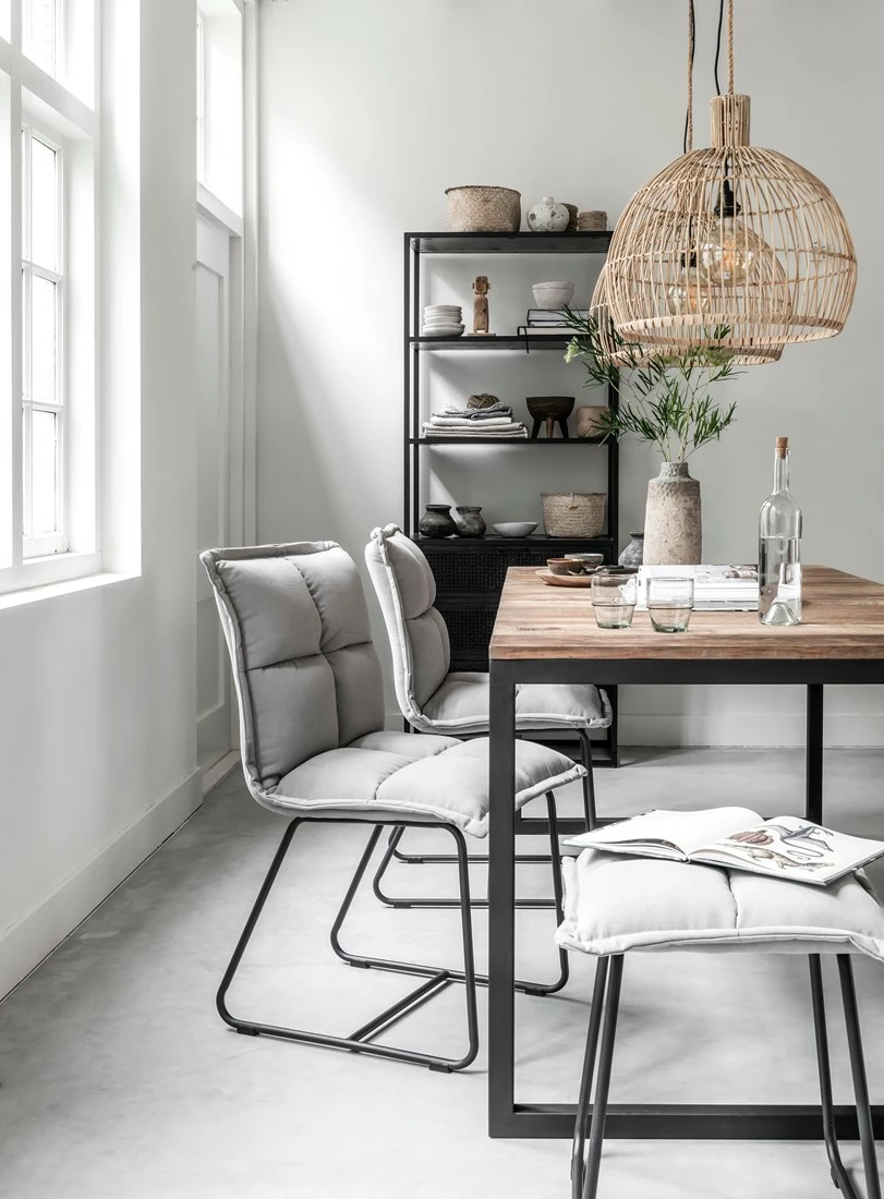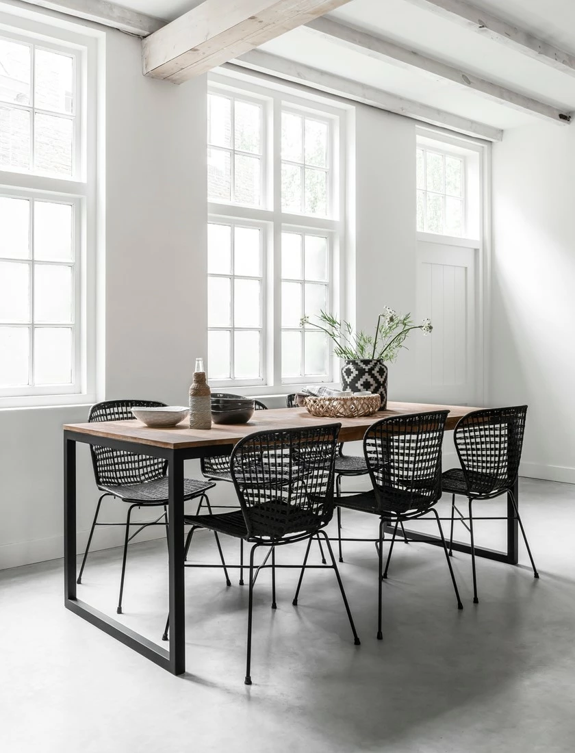 Tyylikäs tiikkipuinen ruokapöytä vahvoilla mustilla metallijaloilla. Useita kokoja. Verkkokaupan koko 200×90. Elemental-sarjan muotoilu on kulmikasta, mutta rouheasti viimeistelty tiikkipinta tuo kotoisuutta ja lämpöä tyyliin. Rouhean lankkupöydän viimeistelee rautajalka, joka nousee pöytälevyn alle korostamaan pöydän mallia.