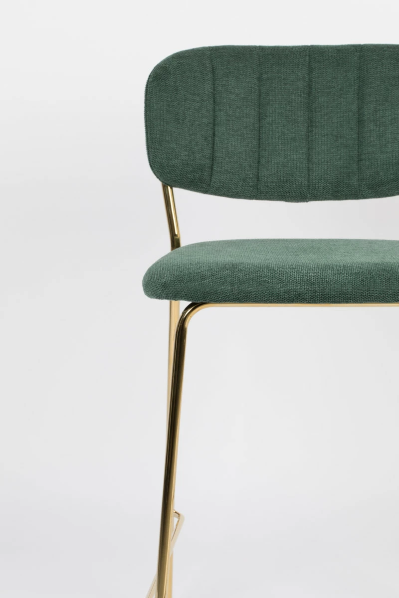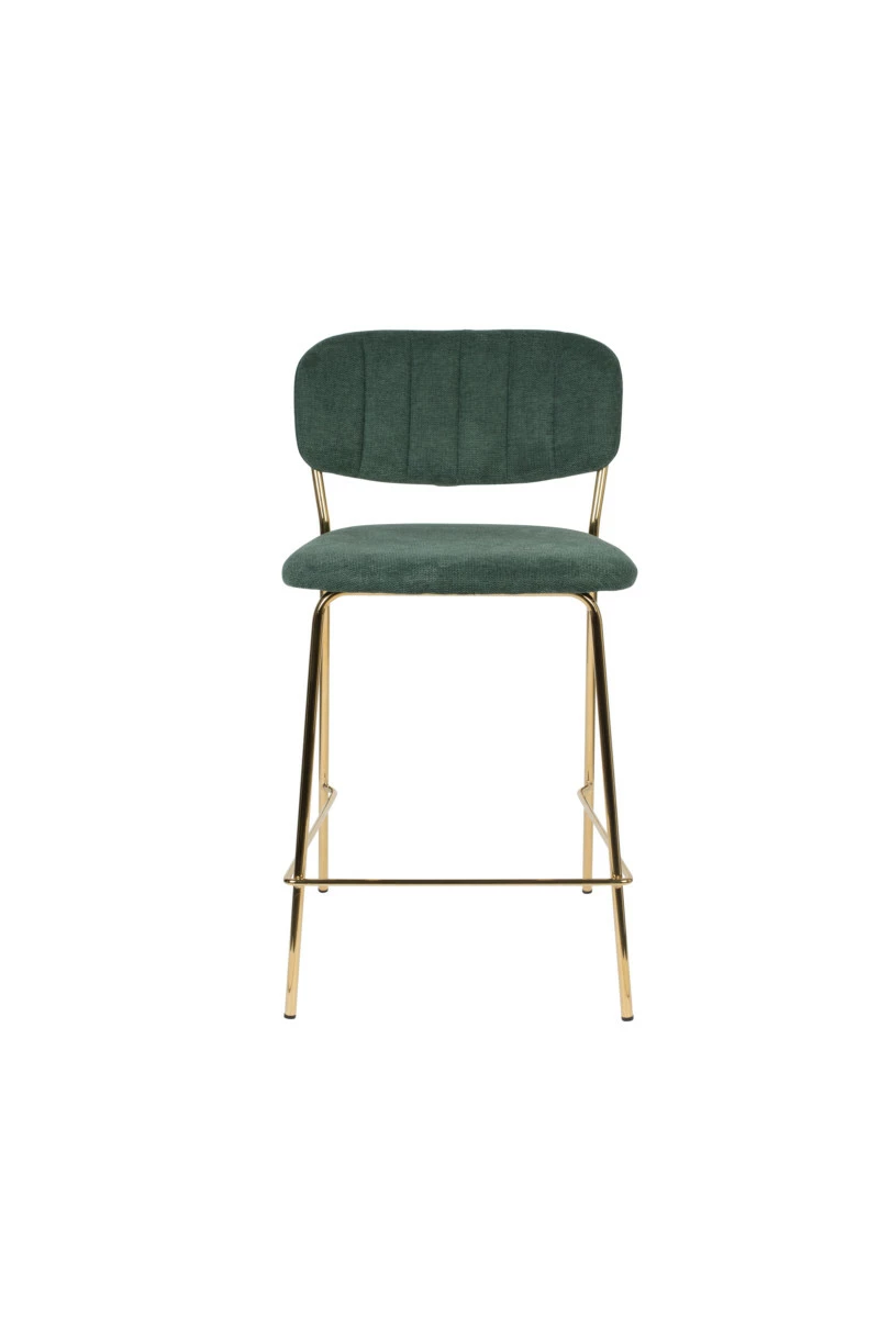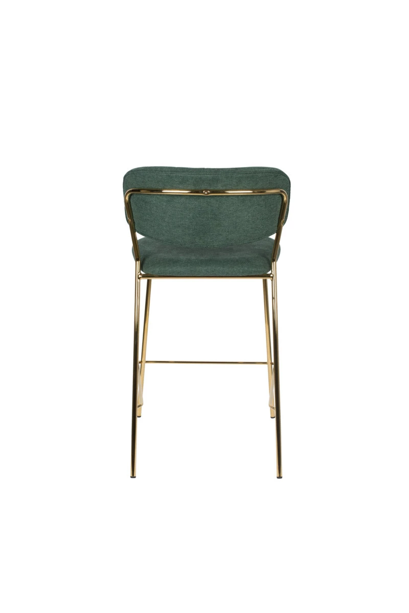 Ihanan pehmeä Jolien baarituoli saarekkeeseen sopivassa koossa. Tummanvihreä samettinen baarituoli supermukavalla pehmustetulla istuinosalla ja kunnon selkänojalla on todella miellyttävä istua. Kultaiset jalat viimeistelevät ylellisen kokemuksen.