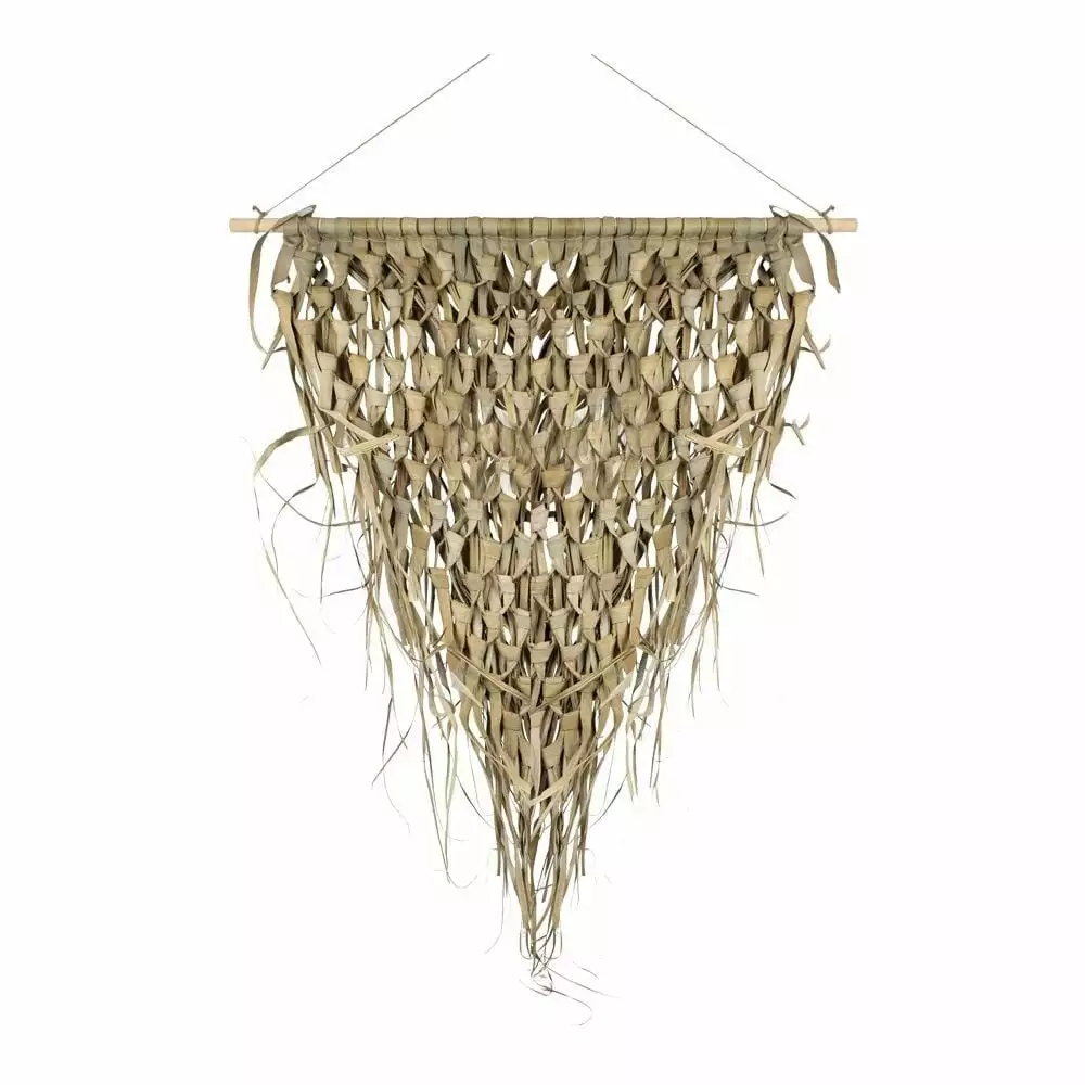 Boho sisustus kohilleen! Palmunlehdistä punottu seinäkoriste on boheemin sisustuksen viimeistelijä. Upeaa luonnonläheistä fiilistä kotiin tai mökille. Ekologista sisustamista parhaimmillaan, kun luonnonmateriaaleja käytetään taidokkaasti ja kekseliäästi! Kolmionmallinen punottu seinävaate roikkuu puukepistä, jossa ripustusnaru. Toimii oivallisesti myös merellisiin sisustuksiin.