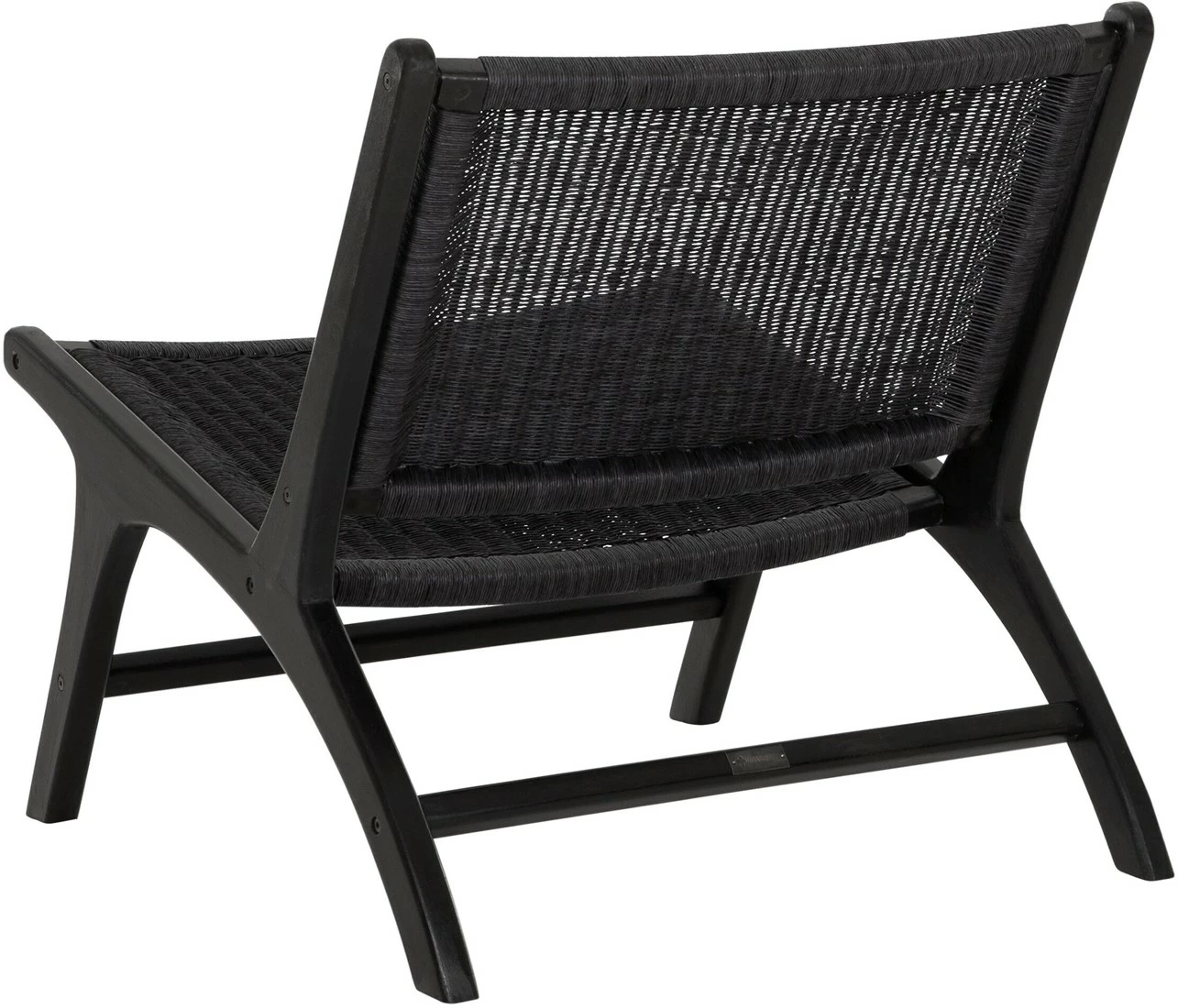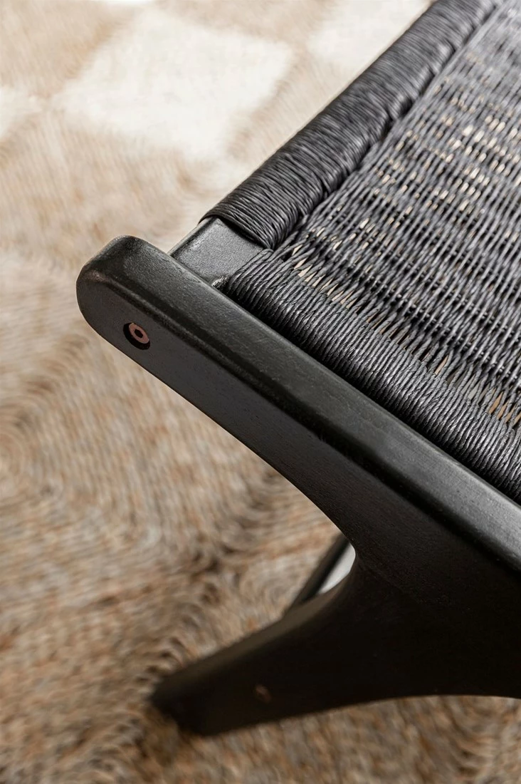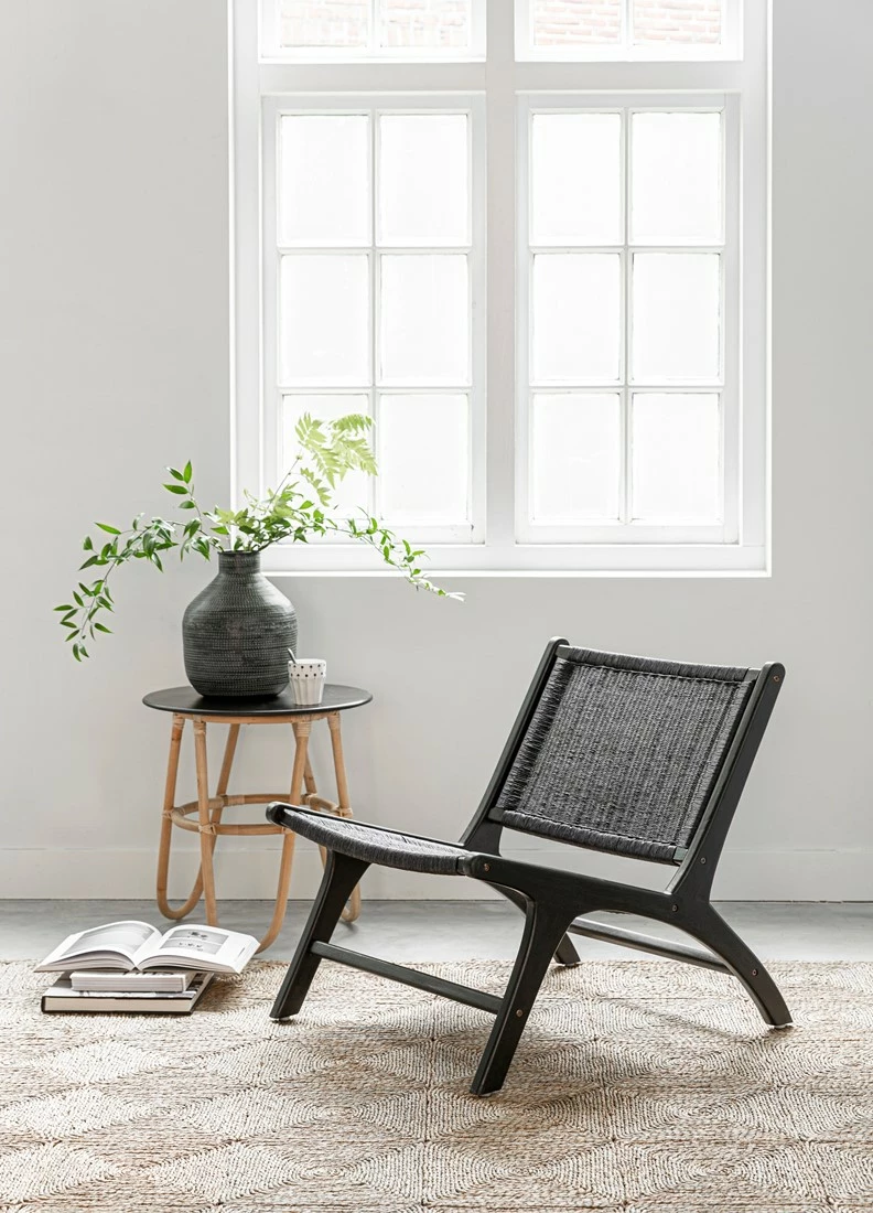 Lazy Loom punottu nojatuoli on miellyttävä ja kaunis kotoisan kodin lepotuoli. Musta väri on punostuolissa yllättävä ja särmä. Tuolin runko on vahvaa tiikkipuutta. Ekologinen kierrätystiikki on sekä eettisesti kestävä että käyttöä kestävä puulaji. Istuinosa on metalliverkon ympärille punottua paperinarua, mikä tuntuu samalla vahvalta että istuintuntumalta pehmeältä. Tässä matalassa nojatuolissa on hyvä istua eikä se tuki maisemaa myöskään ikkunan edessä.