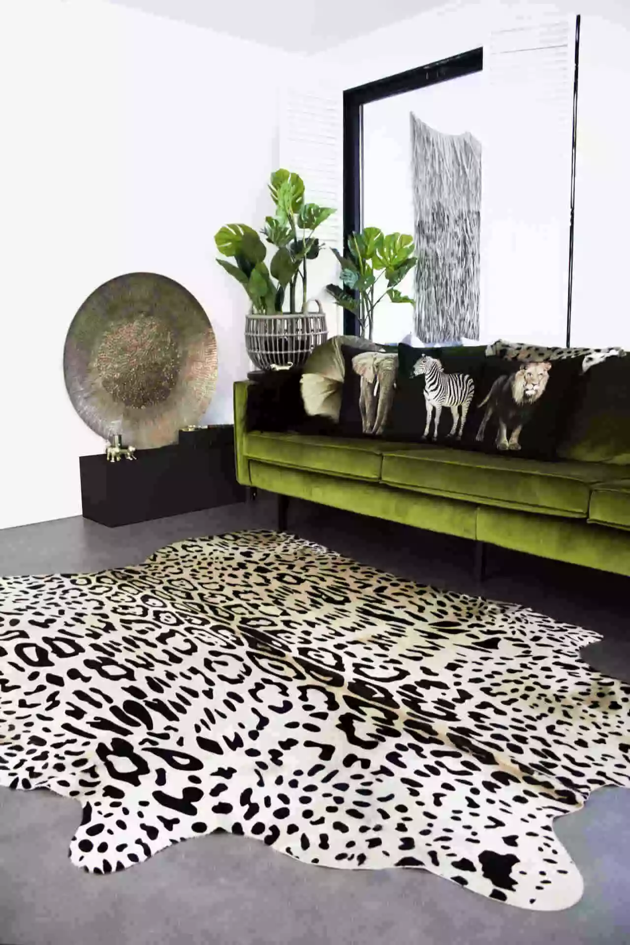 Supertrendikäs taljamatto luonnonläheiseen sisustukseen. Suuri näyttävä lehmäntalja jaguaarin täplillä on varma katseennaulitsija olohuoneessa. Sopii moneen tilaan, varsinkin silloin kun neliskanttiset tai pyöreät matot tuntuvat hankalilta. Luonnollinen muoto tuo elävyyttä ja huomiotaherättävä värjäys vahvaa säpinää sisustukseen.