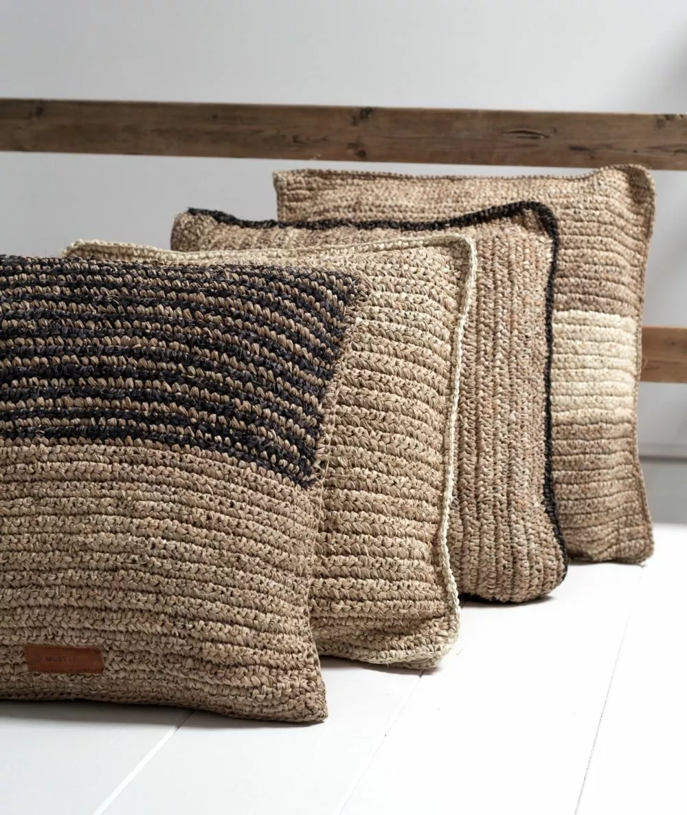 Näyttävän muhkea luonnonläheinen boho sisustustyyny. Laadukas palmunlehti on punottu kauniiksi tyynynpäälliseksi ja värjätty osittain mustaksi. Luonnonmateriaali tuo mukavasti maanläheistä lämpöä sisustukseen, niin sisätiloihin kuin vaikka terassillekin. Tutun juuttityynyn luksusversiosta ei jää hituleita soffalle eikä Aino-tädin mustaan kolttuun myöskään. Upea materiaali kerrassaan! Tällä tuotteella tuot vähän tyylikästä luksusta sohvatyynyjen joukkoon harmonisella tavalla. Sisätyyny sisältyy.