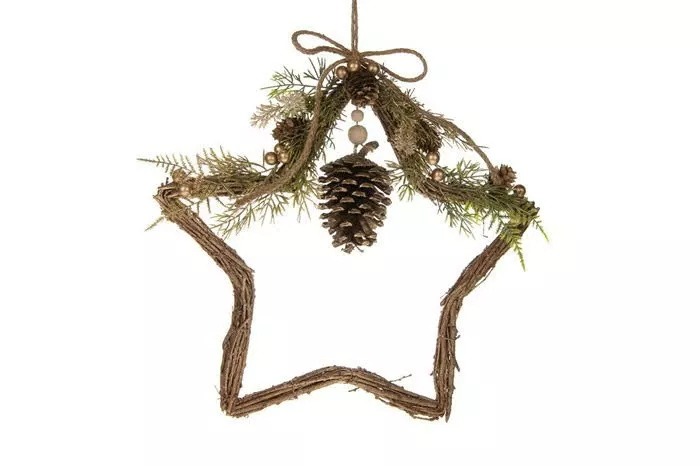 Natural Collections tähti ovikoriste. Kaunis ja huolellisesti tehty tähden mallinen ovikranssi. Tuo kotiin luonnonläheistä vanhan ajan joulutunnelmaa. Kultaiset helmet ja ruskea, kauniisti punottu juuttinaru.