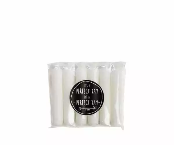 Söpöt valkoiset pienet kruunukynttilät kivassa paketissa. Täydellinen pikkulahja, tai omaa kattausta piristämään! It’s a Perfect Day for a Perfect Day -minikynttilät on käsinvalmistettu korkealaatuisesta parafiinista. 6 kynttilää paketissa. Lyhyet kruunukynttilät käyvät myös silloin kun isommat eivät sovi. Paloaika 5h. Paljon ihania värejä.