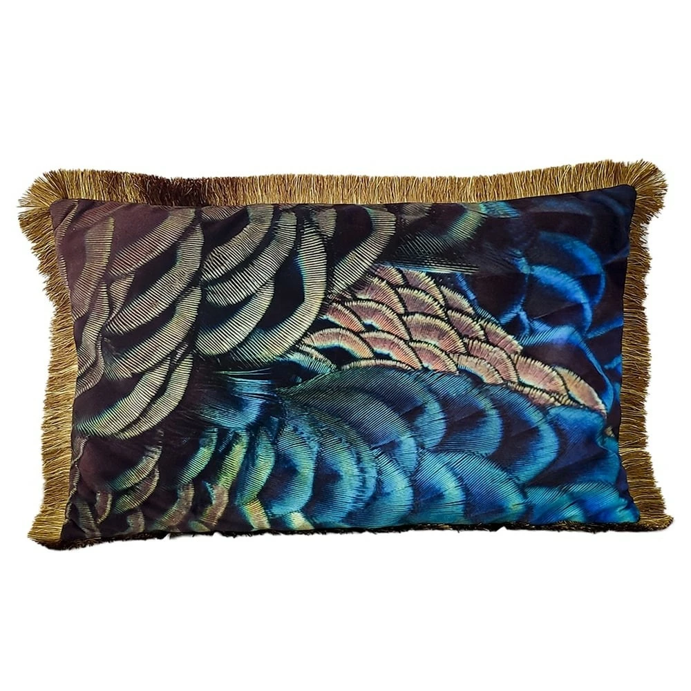 Upea sininen sisustustyyny riikinkukon sulka-aiheella. Vahvan ja uskaliaan sisustajan kuviointi ja väri. Koboltin sininen yhdistettynä kultaan on melkoisen “royal”. Irrotettava sisätyyny sisältyy. Pesu 30 ‘C.