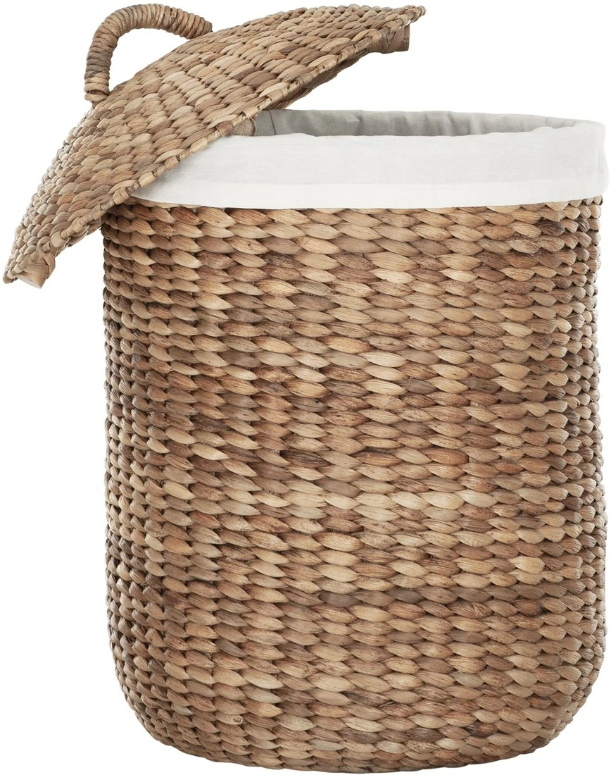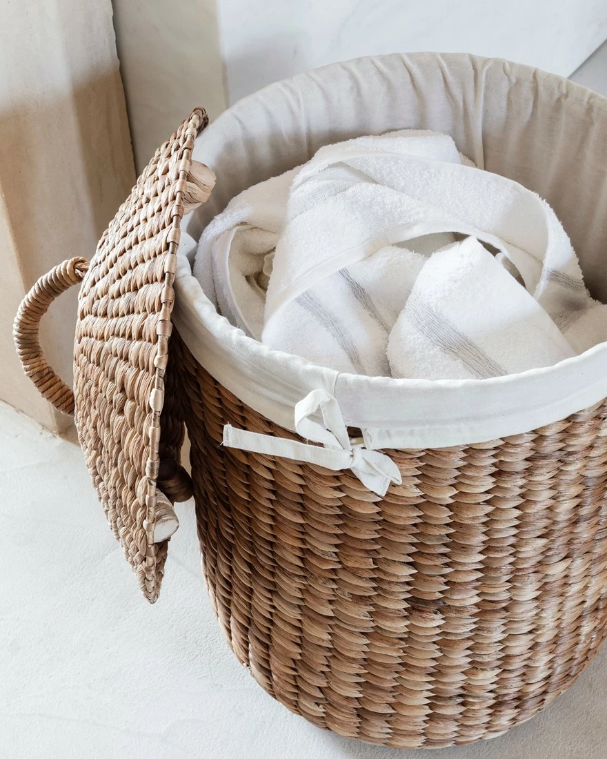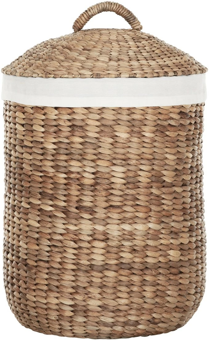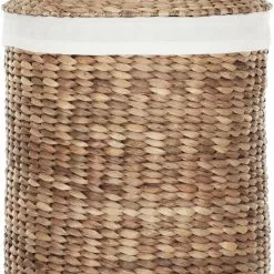 Kaunis Tahiti pyykkikori kangasvuorella on sekä käytännöllinen, ilmava että kaunis pyykkikori. Kestävä vesihyasintti on korimateriaalina verraton, sillä sitä kerätään haitallisena vieraslajina ja sen punomisominaisuudet sekä kestävyys ovat omaa luokkaansa. Vahva kori raikkaan valkoisella puuvillakangasvuorella.