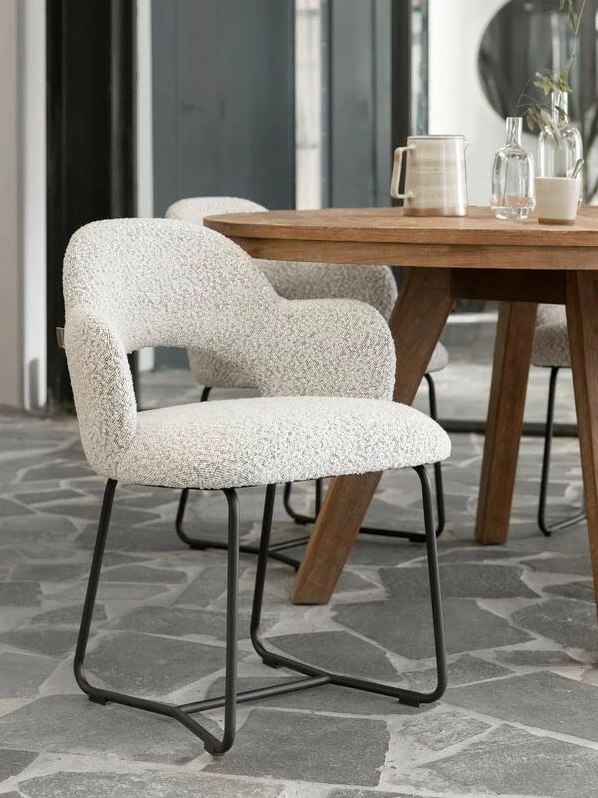 Käsinojallinen Vista ruokapöydän tuoli kutsuu istumaan pidempääkin iltaa. Tuolissa on metallinen tukeva runko ja jalat sekä miellyttäväksi pehmustettu bouclekankainen istuinosa. Pienet käsinojat tuovat extramukavuutta. Harmaa tuoli on helppohoitoinen värivalinta. Istuimen jämäkkä mutta pehmeä selkänoja on muotoiltu hieman kuppimaiseksi, mikä tekee tuolista istuinmukavuudeltaan huippuhyvän.